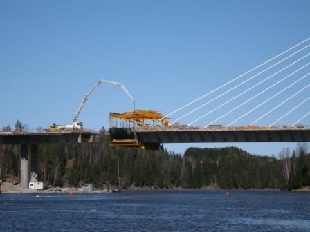 Utbygging av E6 gjennom Østfold er prosjekter med store betongkonstruksjoner. På bildet er vår 36 meter pumpe i gang med å støpe en søyle til den nye Sandesund bro.